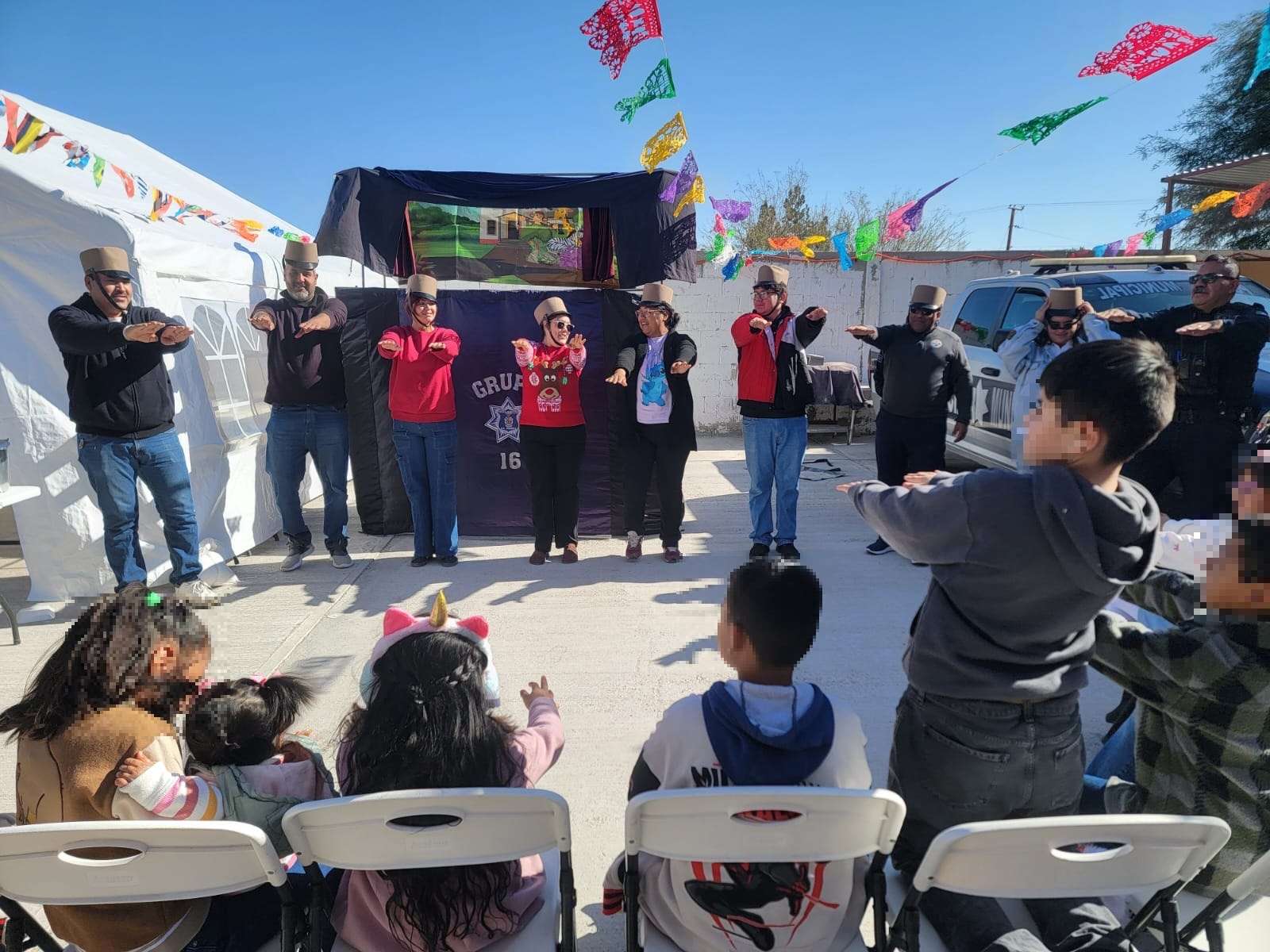 Ciudad Juárez.- Elementos adscritos a la Dirección de Prevención Social de la Secretaría de Seguridad Pública Municipal, realizaron una presentación de “Teatrino” en la Capilla de la Candelaria, como parte de las actividades de una posada navideña organizada para los niños que asisten a clases de catecismo